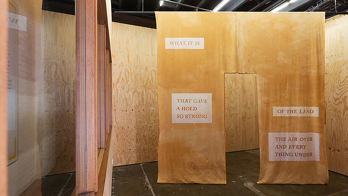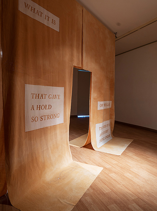 Four suspended lengths of dyed batik panels are inscribed with boxed text fragments that read as: